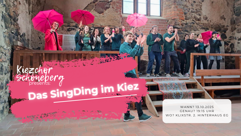 Das SingDing ist ein neues Herzensprojekt, das schon lange in unseren Köpfen war und nun endlich in die Tat umgesetzt wird. Wir als Kiezchor wollen den Kiez ein bisschen mehr zusammenbringen und das natürlich auf musikalischem Weg. Das Projekt ist also nicht nur für uns, sondern vor allem für euch und den Kiez gedacht.